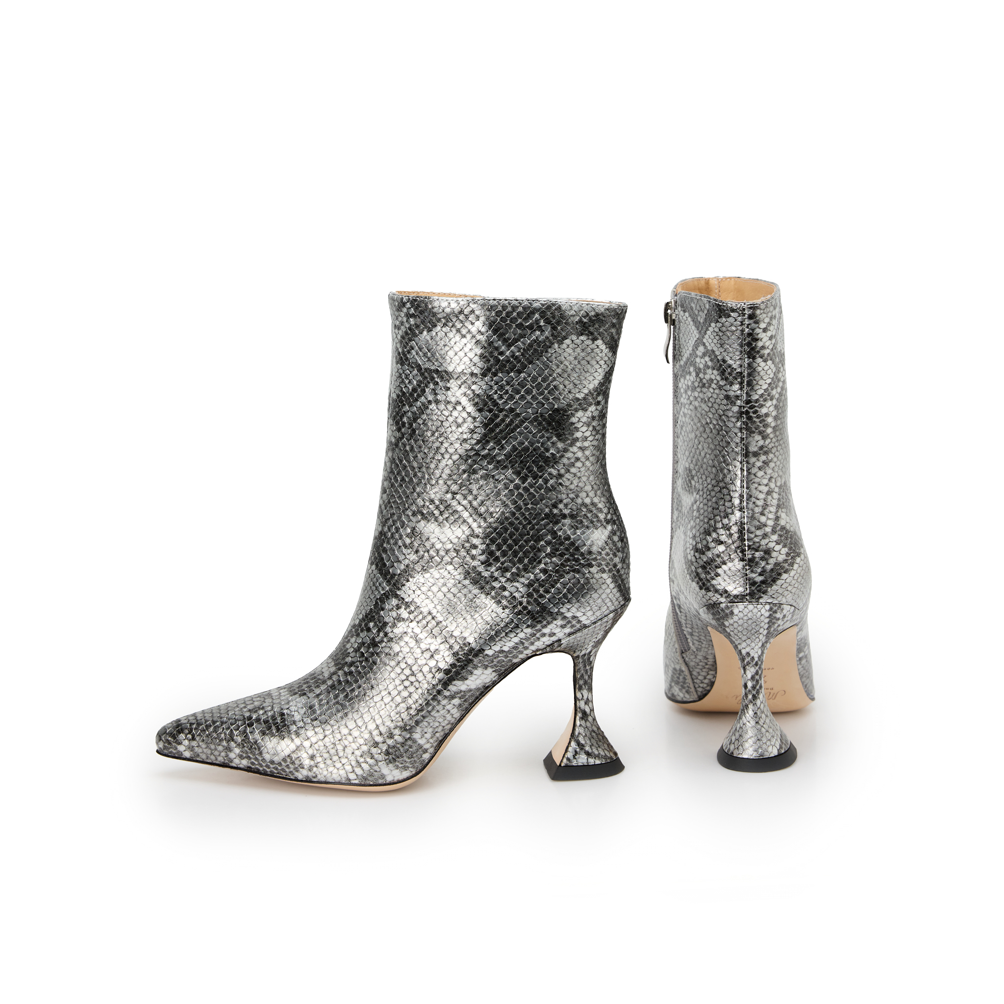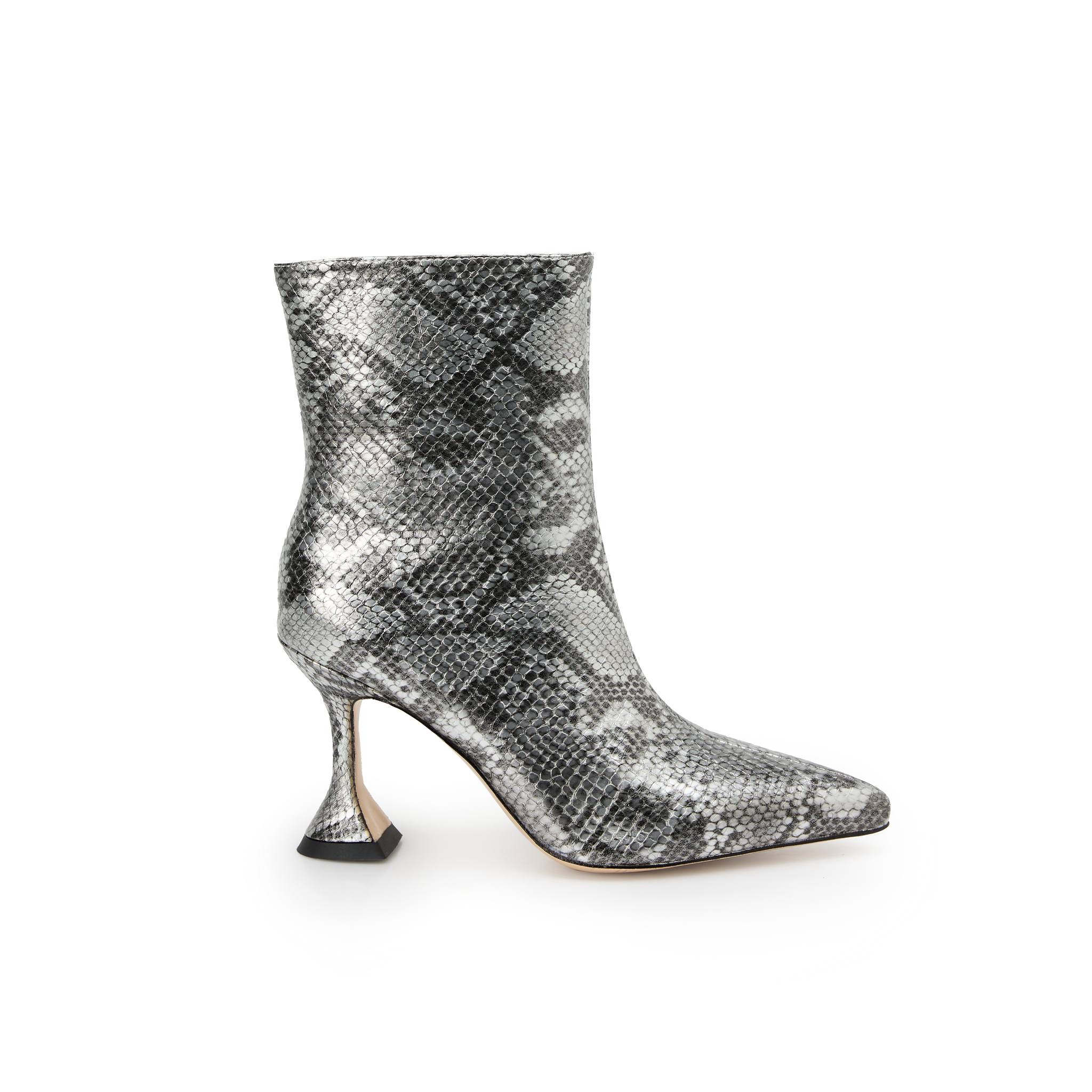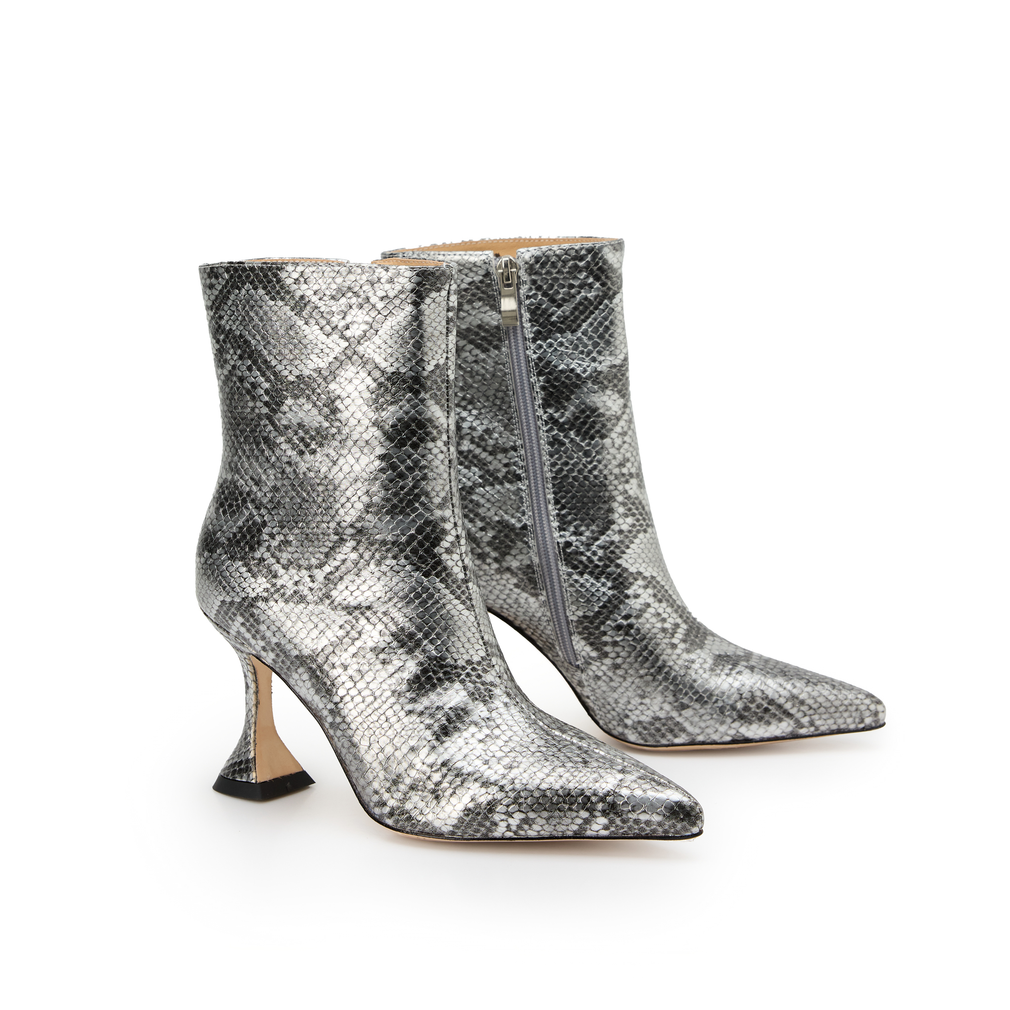 Aceste botine sunt expresia elegantei indraznete, inspirate din estetica high-fashion. Realizate din material premium cu print exotic tip piele de sarpe, acestea adauga un accent sofisticat si puternic oricarei tinute. Varful ascutit alungeste piciorul, iar tocul scuptural de 7 cm ofera un echilibru perfect intre stil si confort.